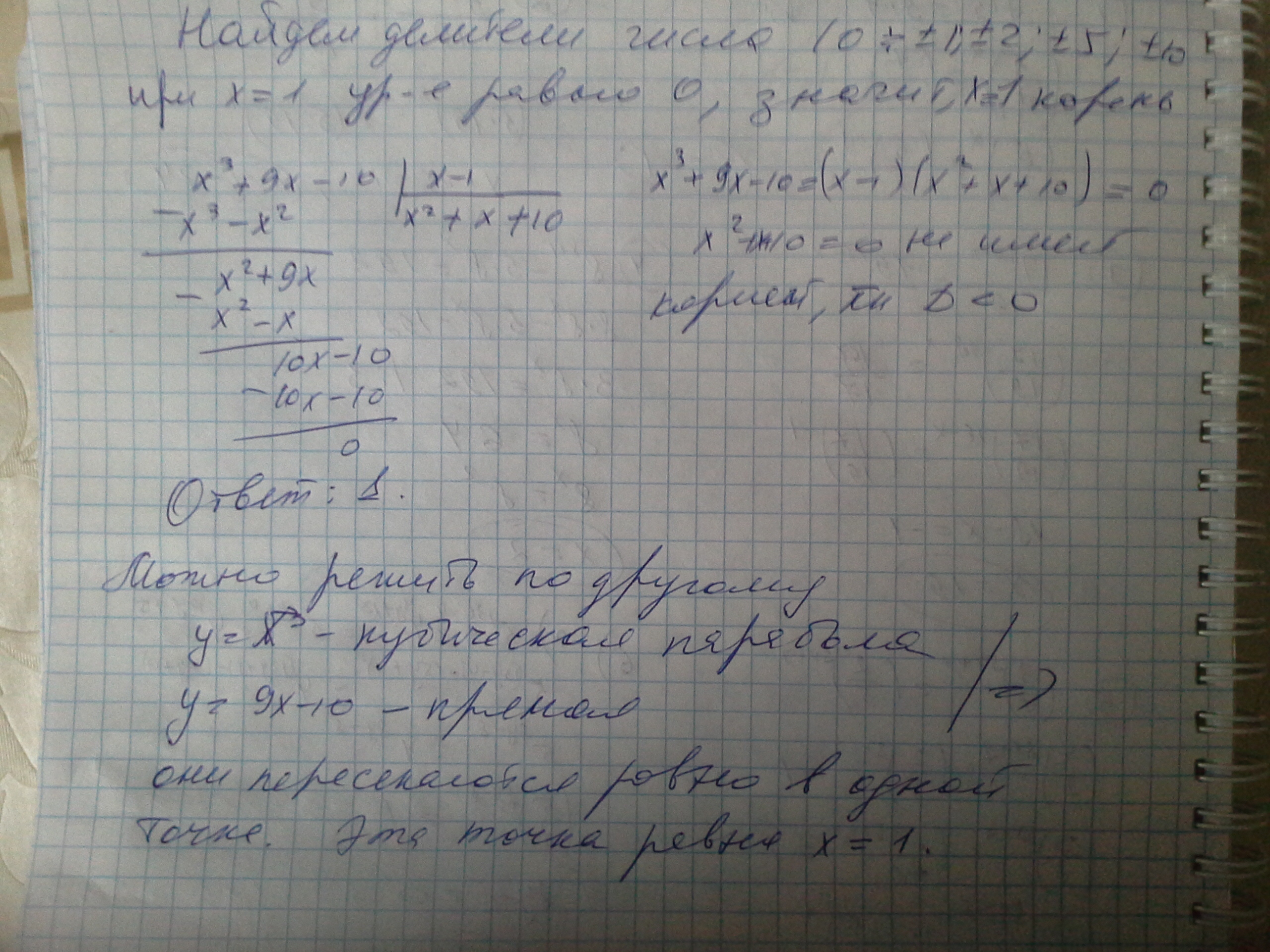 x = 1 корень (делитель 10) ⇒x³+ 9x -10 делится (x -1) _Теорема Безу