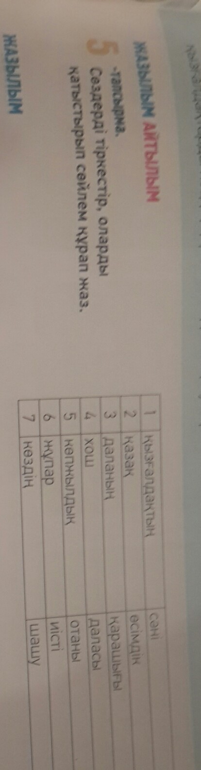 Қызғалдақтың отаны-Қазақстан. Қазақ даласы кең байтақ. Даланың сəні гүлдер. Хош иісті раушан гүлі ауламызда өсіп тұр. Жусан көпжылдық өсімдік. Бақбақ жұпар шашып тұр. Қымбат заттарымды көздің қарашығындай сақтаймын