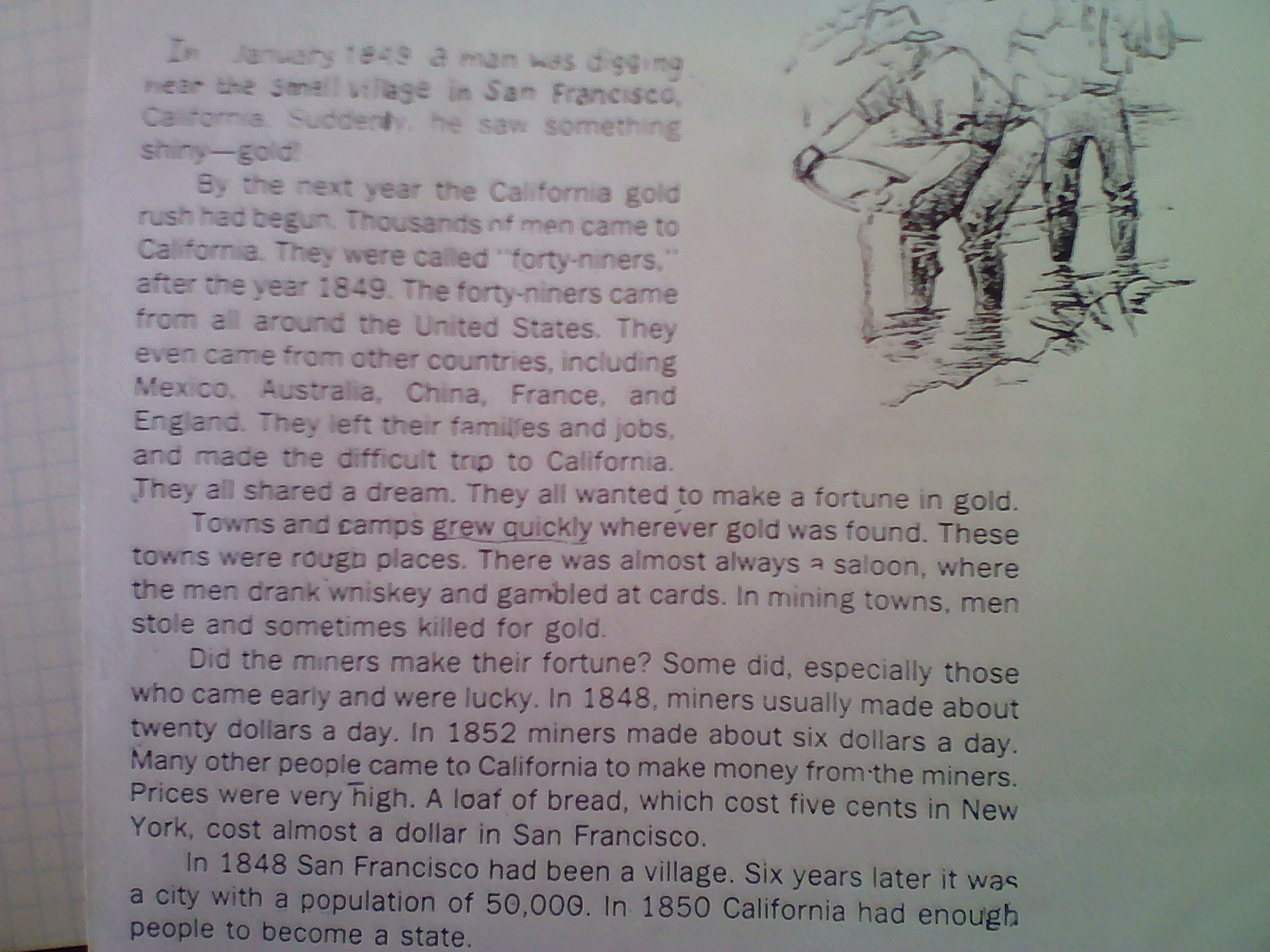 Плохо видно: Сан-Фрэнс, нанятый Eg rest year, часовая цыганская золотая лихорадка. Они были сорок девятнадцать человек, после 1649 года. Сорока девяти человек приехали из Соединенных Штатов. Они даже пришли в другие страны, включая We eco, Austra China. Франции и Англии. Они оставили свои семьи и рыбки. и совершили поездку по эффективности в Калифорнию. Они поделились мечтой. Они все хотели разжигать муку в городах и лагерях. Заварить шарлатану там, где было найдено золото. Эти города были рудиями. Почти всегда существовали люди, где мужчины пили wnskey и играли на карточках в шахтерских городах, мужчины украли и иногда убивали за золото, добытые шахтерами. какой-нибудь сделал. особенно тех, кто приехал в Гари и повезло в 1848 году. Шахтеры обычно делали около двадцати долларов в день. В 1852 году горняки делали о сих колларах кей. Мэри другие люди пришли в Калифорнию, чтобы заработать деньги у шахтеров. Цены были очень высокими. Буханка хлеба, стоимость которой в пять центов в Нью-центрах стоила почти доллару в Сан-Франциско. в 1848 году деревня Сан-Франциско через шесть лет это был город с населением 50 000 человек. люди, чтобы стать государством