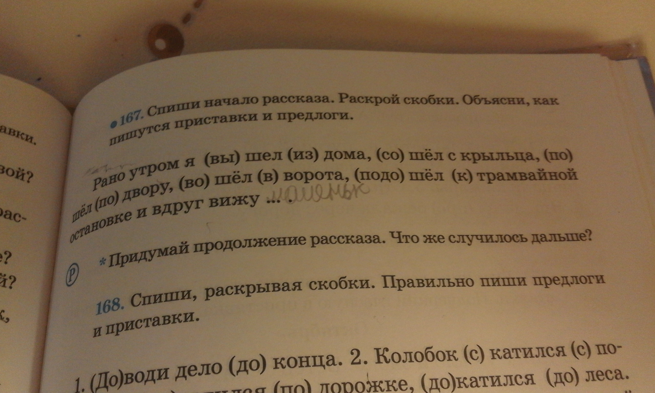 Рано утром я вышел из дома сошел с крыльца, пошёл по двору вошел в ворота, подошёл к трамвайной остановке и вдруг вижу моего друга сережу! Мы радовались встрече и пошли вместе делать у роки, а потом поехали на день рождения к Пете.