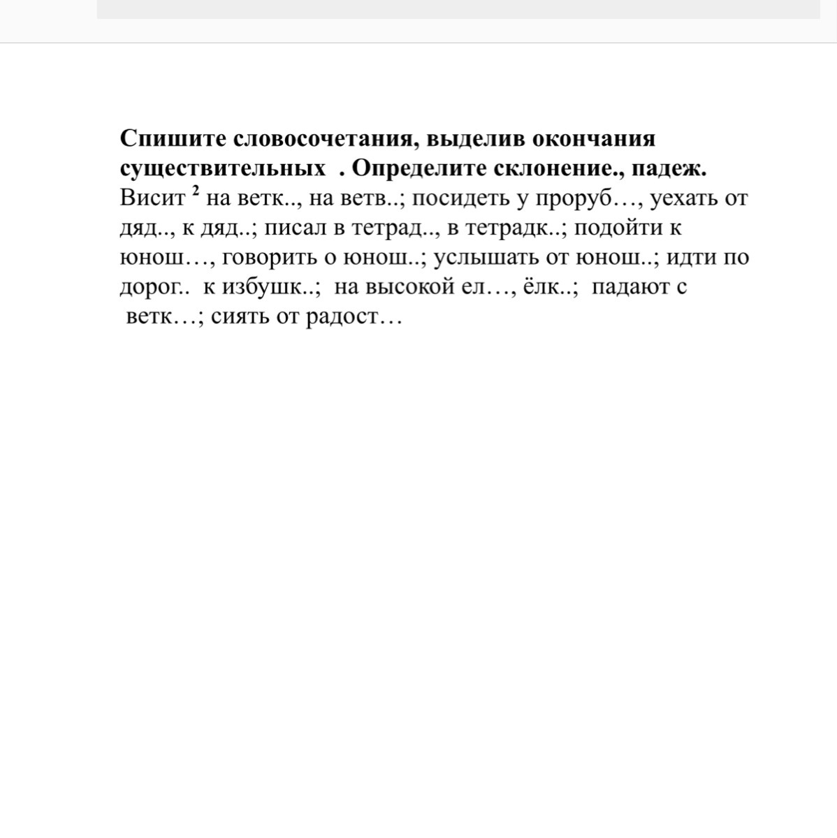 Висит на ветке,на ветве;посидеть у прорубить, уехать от дяди,к дяде;писал в тетради, в тетрадке;подойти к юноше,говорит о юноше;услышать от юноши, идти по дороге к избушке; на высокой ели,ёлке; падают с ветки; сиять от радости