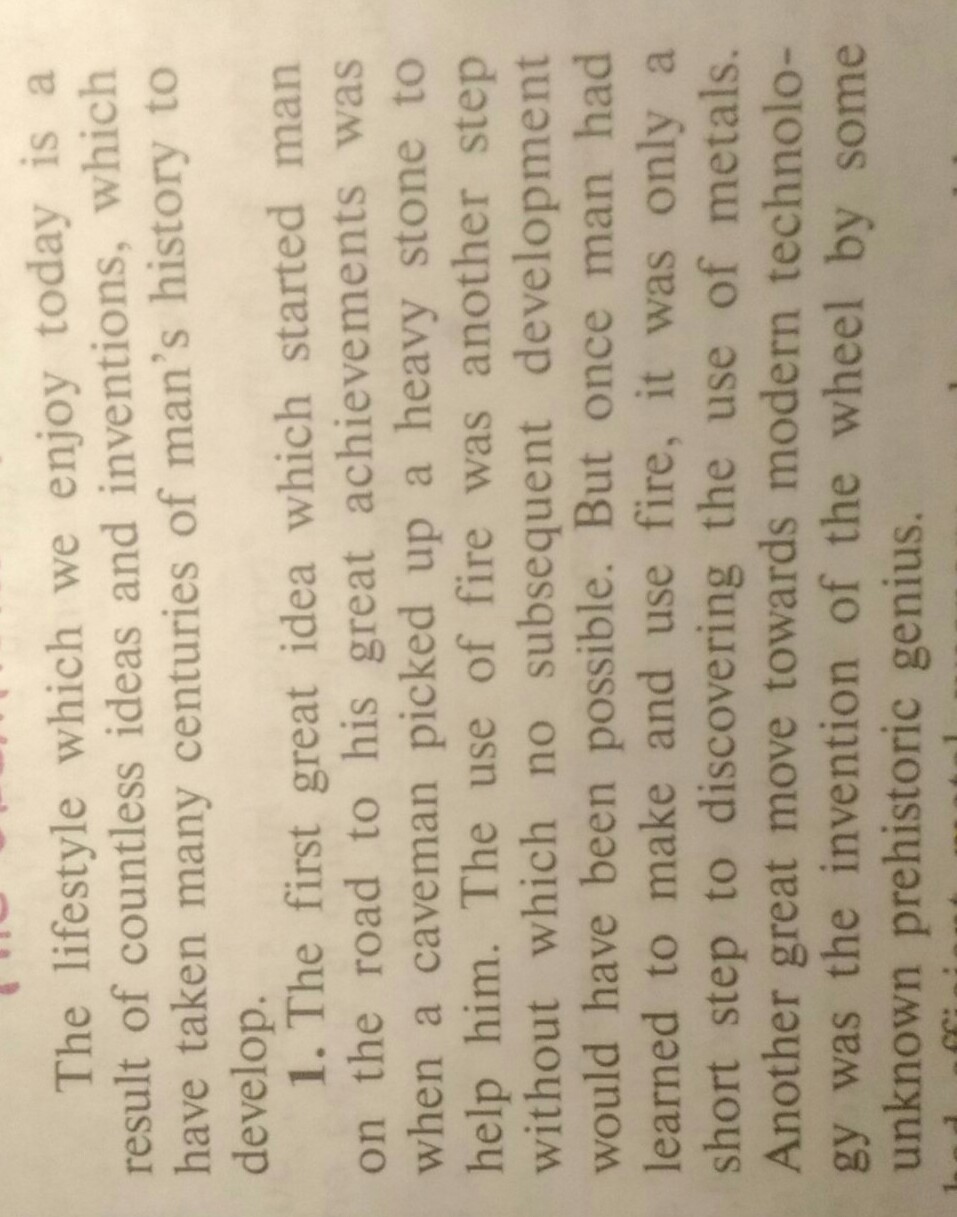 Образ жизни, которым мы наслаждаемся сегодня, является результатом бесчисленных идей и изобретений, которые развили многовековую историю человечества. 1. Первая великая идея, которая запустила человека на пути к его великим достижениям, - это когда пещерный человек взял тяжелый камень, чтобы помочь ему. Использование огня было еще одним шагом, без которого последующее развитие не было бы возможным. Но как только человек научился делать и использовать огонь, это был всего лишь короткий шаг к открытию использования металлов. Еще одним большим шагом к современной технологии было изобретение колеса каким-то неизвестным доисторическим гением.