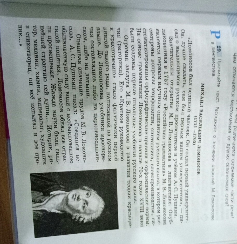 "Ломоносов был великий человек". Он создал первый университет. В 1757 году опубликована "Российская грамматика" М. В. Ломоносова является первым научным описанием русского языка. В начале 70-х годов XVIII в. созданы первые учебники русского языка. М. В. Ломоносов написал " Краткое руководство к красноречию". До него учебники красноречия составлялись на церковнославянском, либо на латыне. Он был: историк, механик, риторик, химик, художник, минералог и стихотворец.