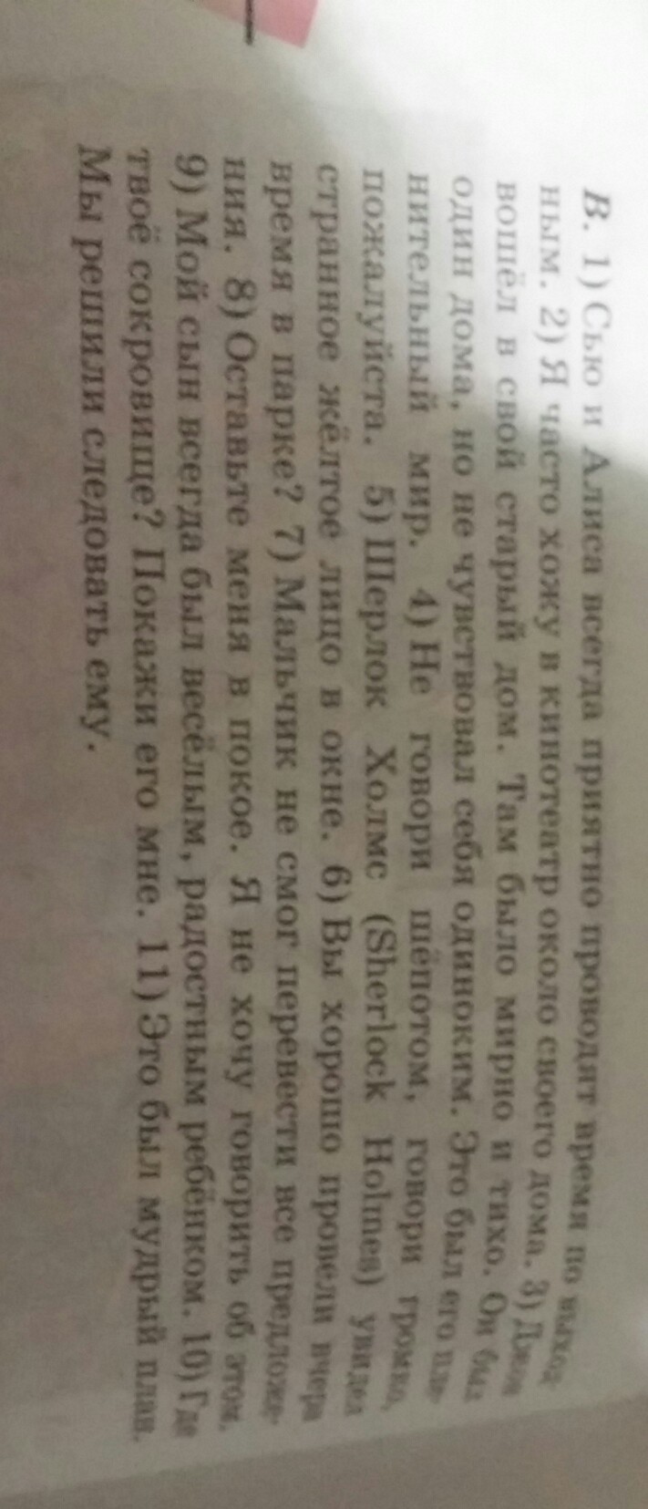 (Имена не умею переводить) always have a good time at the weekend.2)I often go to the cinema next to my house.3) (имя не понятно) (незнаю ) in his house. There was quiet and (мирно). He was (что то там) world.4) Don’t speak (шепотом). Рleese speak (громко).4)Sherlock Holmes looked strange yellow face in the window.6) Have you got a good time in the park in the evening?7) The boy can’t translate (предложения).8) (сорибез понятия) I don’t want to speak (об этом)9) My son always was happy,funny child.10) Where is your (сокровище)?(опять без понятия) 11) It was smart (чаво там написано?).We (опять не знаю)