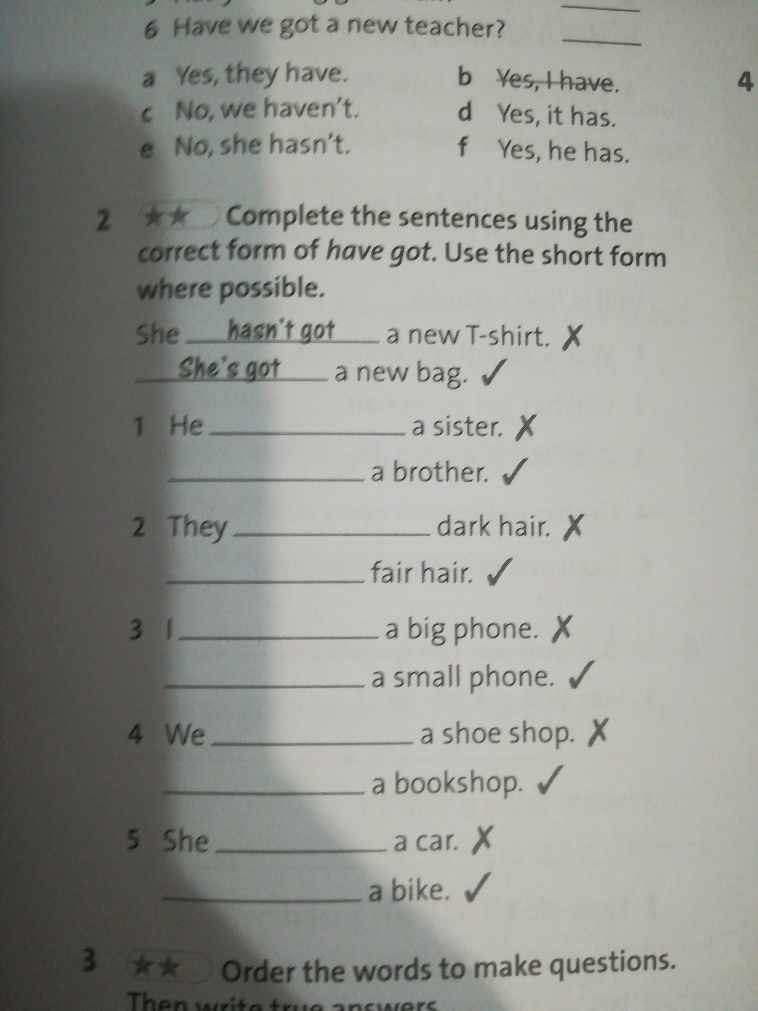 5) She hasn't got a car. She's has got a bike.