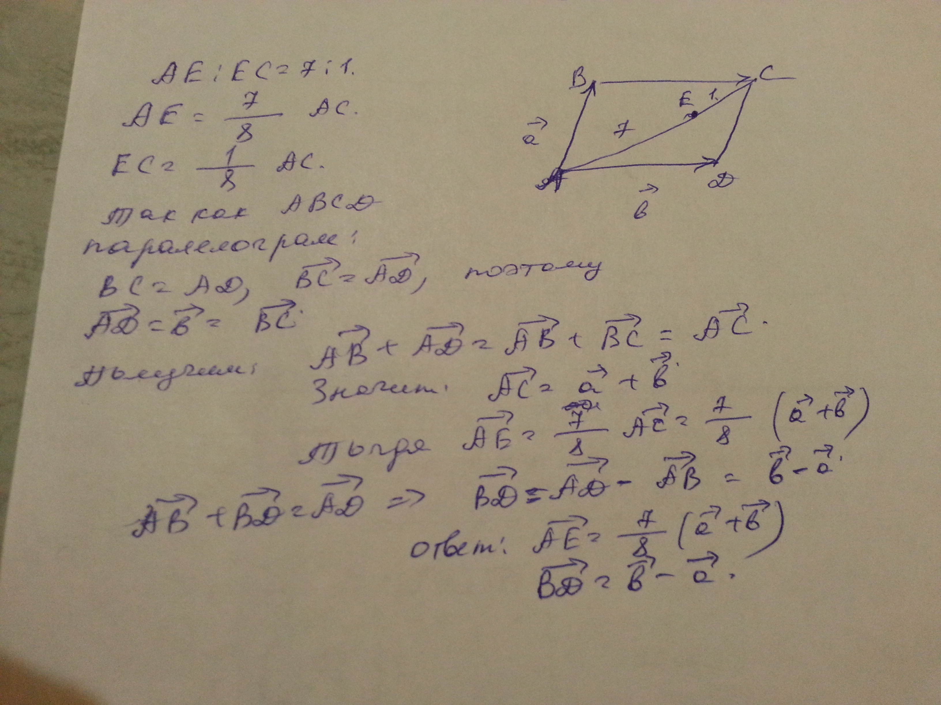 В параллелограмме ABCD точка E делит диагональ AC на части AE : EC=7:1.Выразите векторы АЕ и ВD через векторы AB=вектор а,вектор AD = вектор в.