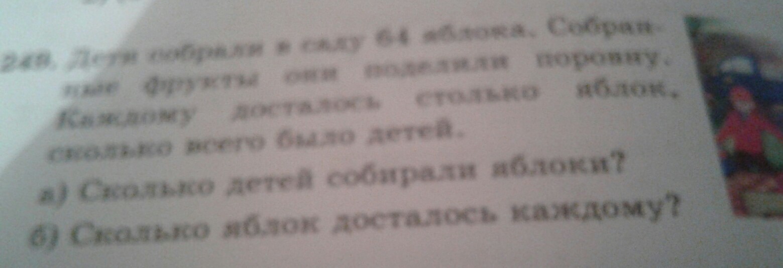 дети собрали в саду 64 яблока. собранные фрукты они поделили поровну. Каждому досталось столько яблок, сколько всего было детей.