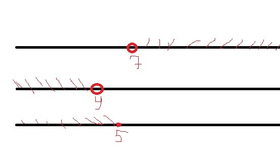 покажите где на координатной прямой изображатся множества чисел модули которых 1) больше 7 2) меньше 4 3) меньше или ровно 5 (нарисуйте пожалуйста или очень понятно объясните)