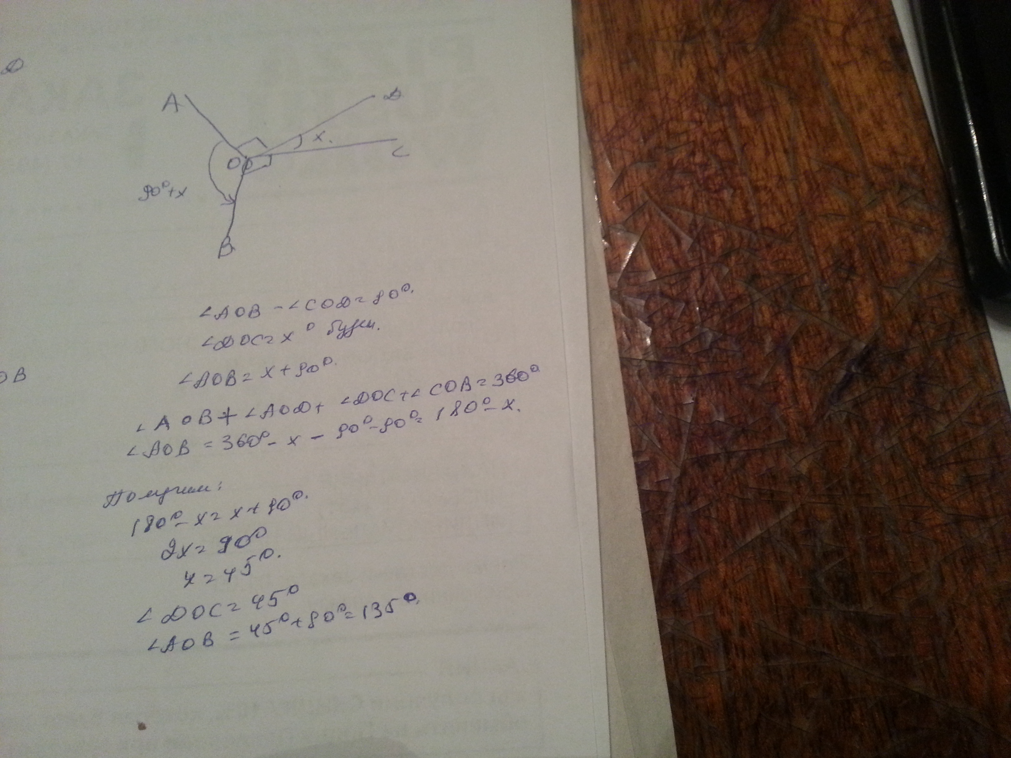 Даны два угла АОВ и DOC с общей вершиной. Угол DOC расположен внутри угла АОВ. Стороны одного угла перпендикулярны к сторонам другого. Найдите эти углы, если разность между ними равна прямому углу.