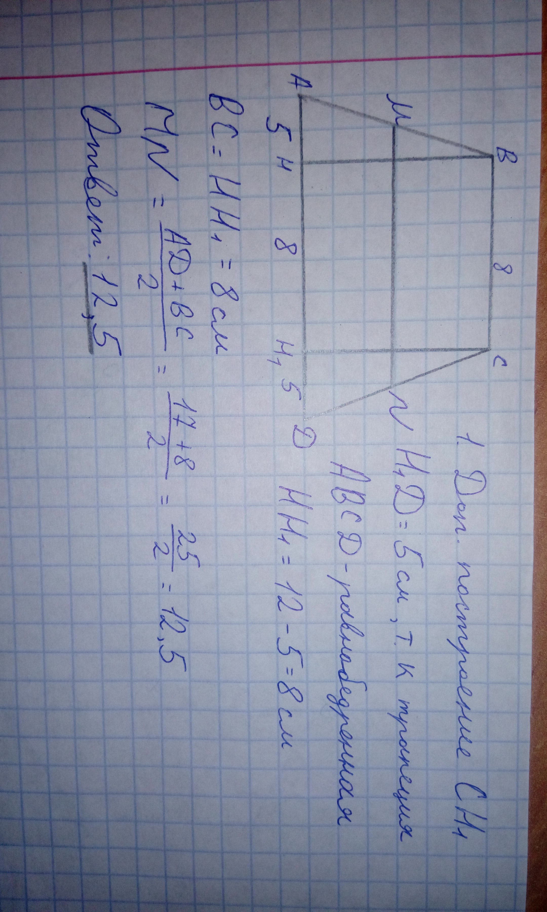В равнобедренной трапеции высота делит большее основание на отрезки, равные 5 и 12 см. Найдите среднюю линию трапеции.(только что бы решение было без косинусов, синусов...