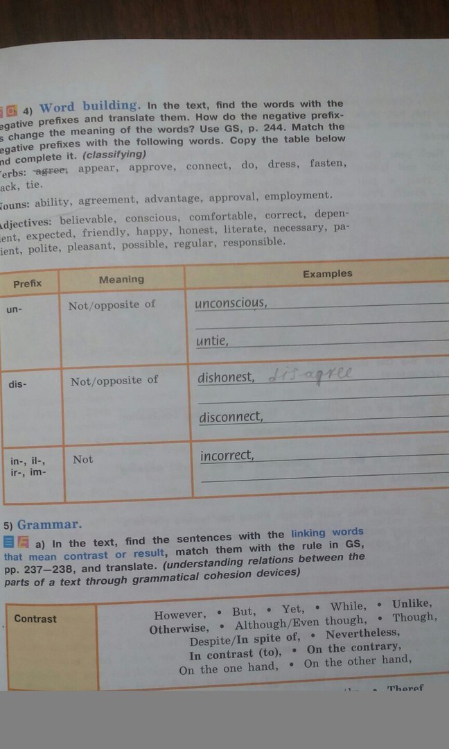 Disagree, disappear, disapprove, disconnect, undo, undress, unfasten, unpack, untie.