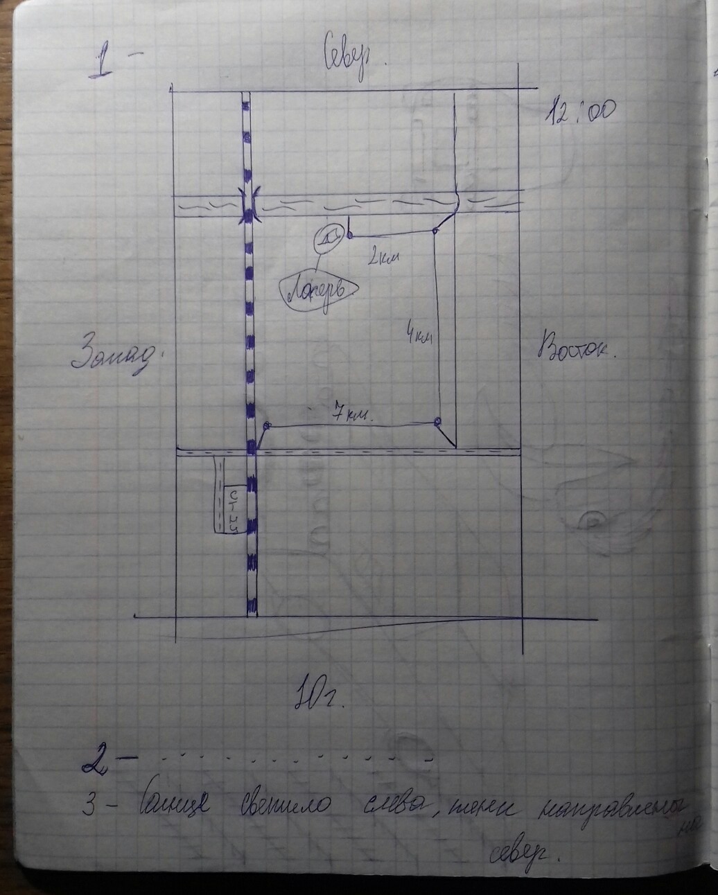 5- если идти обратно, то 2 + 4 + 7 = 13 км. А если идти вдоль реки на запад 7 - 2 = 5 км до железной дороги и + 4 км (дорога-река) равно 9 км...