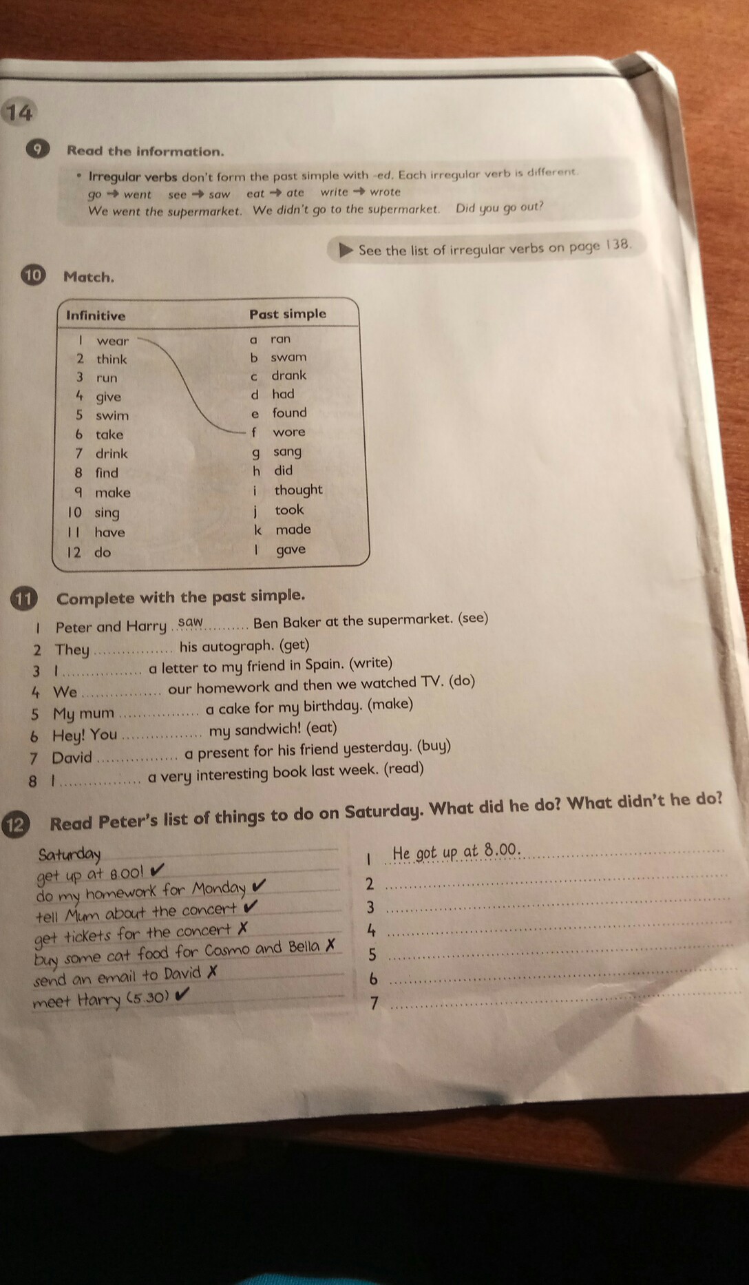 Номер 10. 2-i 3-a 4-l 5-b 6-j 7-c 8-e 9-k 10-g 11-d 12-h Номер 11. 2-got 3-wrote 4-did 5-made 6-ate 7-bought 8-read