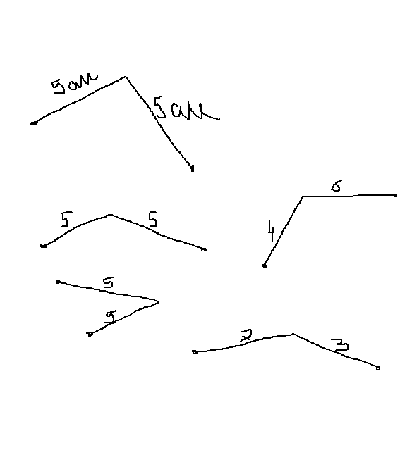 Помогите решить: начерти пять ломаных линий длиной 1 дм, каждая из которых состоит из двух звеньев.