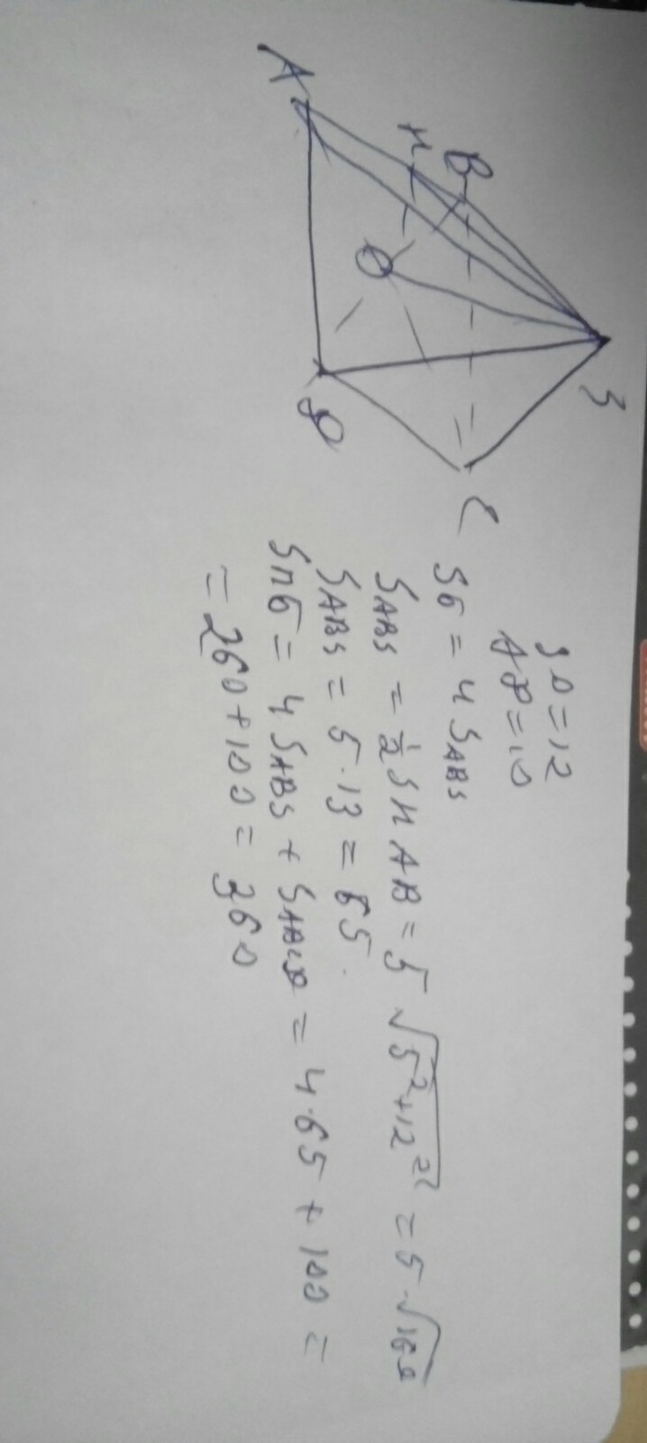 высота правильной четырехугольной пирамиды равна 12 см, а сторона основания -10 см найдите: Sб.п. и Sп.п.