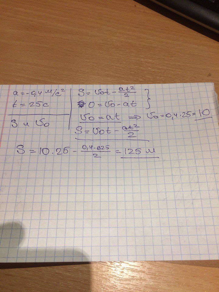 Поезд движущийся после начала торможения с ускорением 0,4 м/с2,через 25 с остановится.Найти скорость в момент начала торможения и тормозной путь поезда