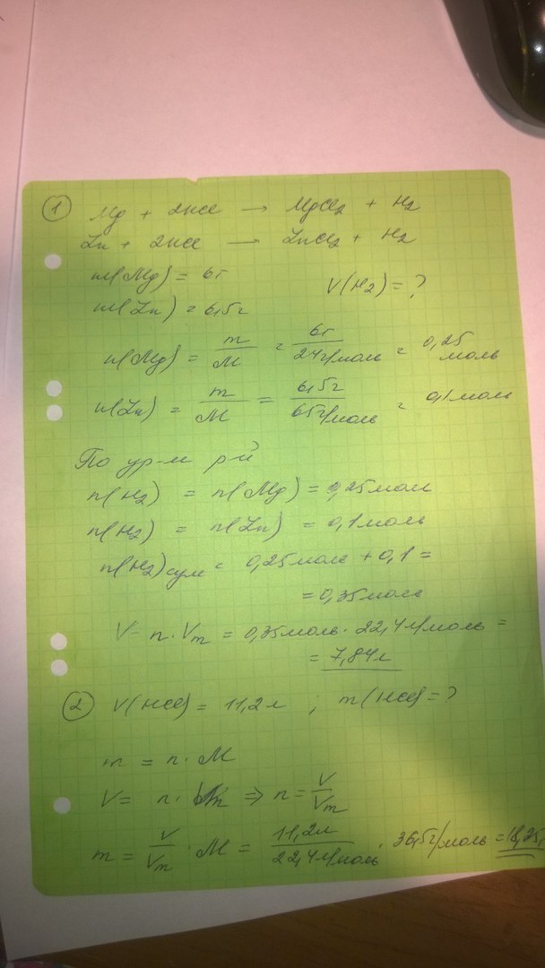 1)В избытке соляной кислоты растворили магний массой 6 г и цинк массой 6,5 г. Какой объем водорода выделится при этом (н.у.)?