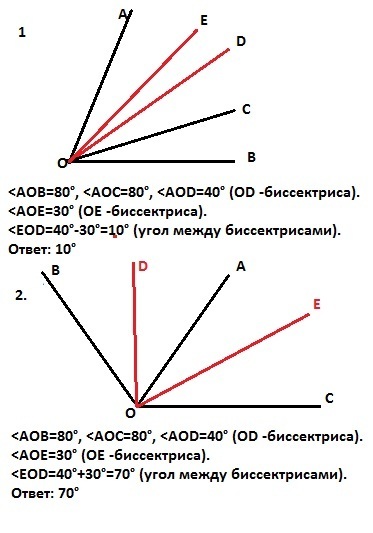 1. <AOB=80°, <AOC=80°, <AOD=40° (OD -биссектриса).<AOE=30° (OE -биссектриса).<EOD=40°-30°=10° (угол между биссектрисами).Ответ: 10°2. <AOB=80°, <AOC=80°, <AOD=40° (OD -биссектриса).<AOE=30° (OE -биссектриса).<EOD=40°+30°=70° (угол между биссектрисами).Ответ: 70°