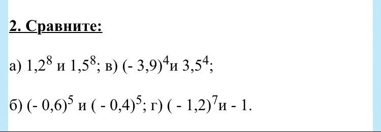 Надо сравнить их основания, потому что у них степень одинаковый , а основания разные: 1,2<1,5; и поэтому: 1,2^8<1,5^8