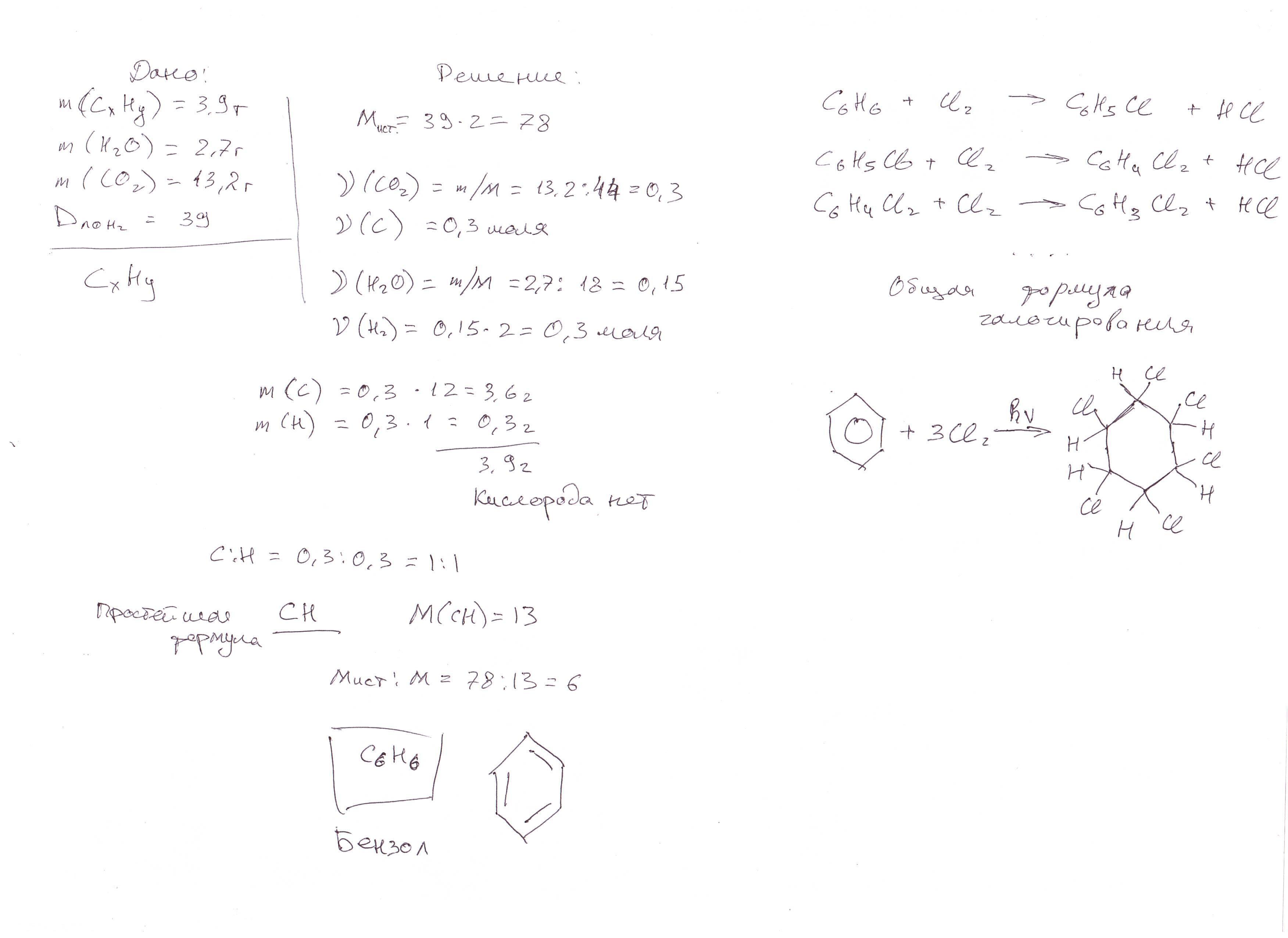 при сжигании 3.9 г углеводорода получили 13.2 г оксида углерода(IV) и 2.7 г воды. известно,что плотность искомого углеводорода по водороду равна 39, но он не окисляется раствором перманганта калия, а в реакции с хлором и