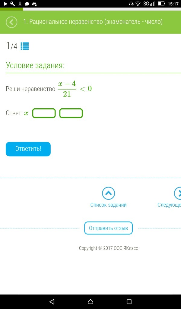 Нужно умножить обе части неравенства на 21(это писать не нужно), получится х-4 .. 0