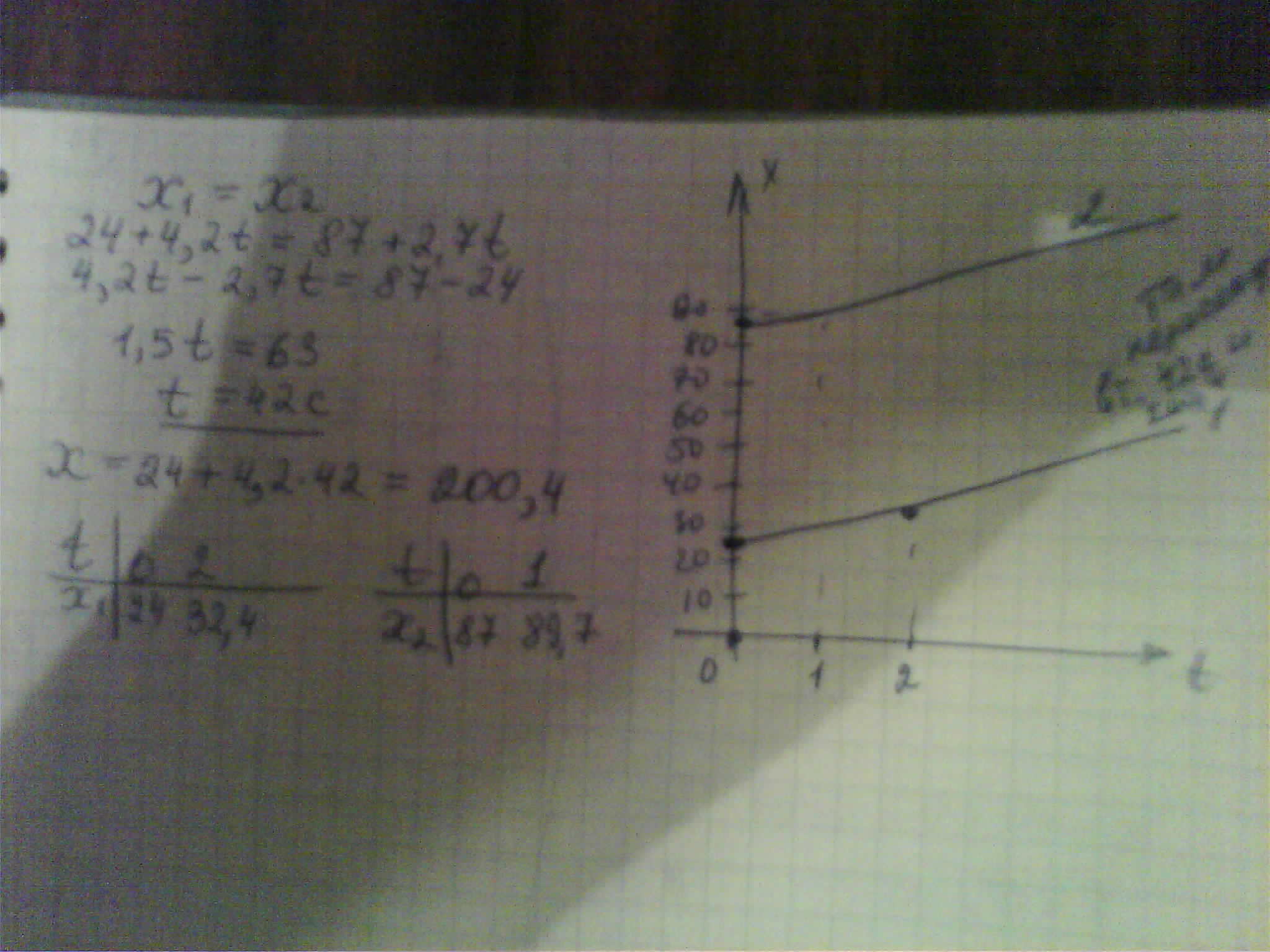 Нужно найти время и место встречи: x1=24+4,2t, x2=87+2,7t. Решить графически и аналитически. Помогите