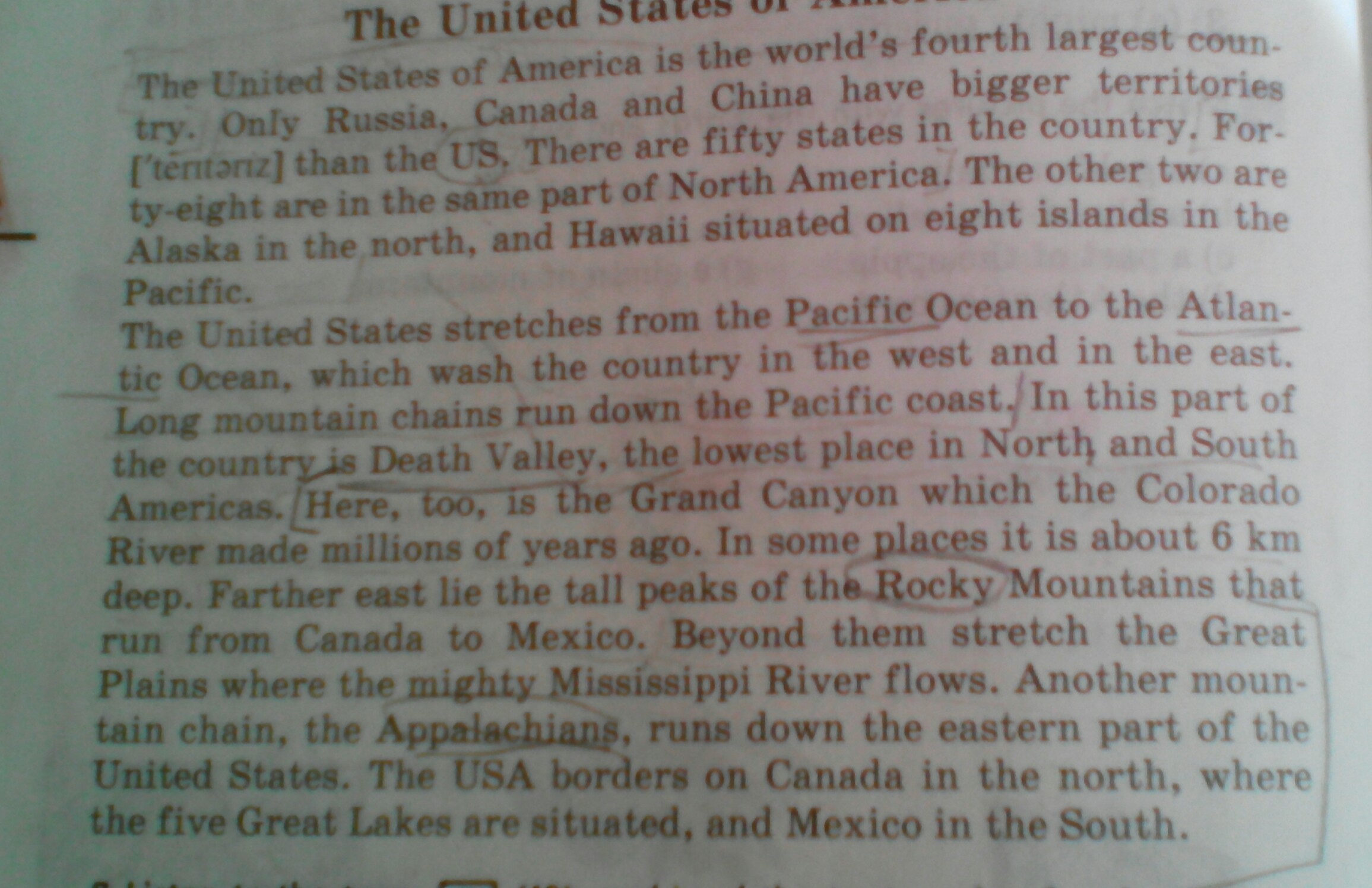 Соединенные Соединенные Штаты Америки являются четвертой по величине в мире камерой. только Россия Канада и Китай имеют большие территории фтеррари), чем США. В стране 50 штатов. восемь человек находятся в одной и той же части Северной Америки. Два других - Аляска на севере и Гавайи, расположенные на восьми островах в Тихом океане. Океан к Атан. Соединенные Штаты простираются от Тихоокеанского галстука-океана, который умывает страну на западе и на востоке. Длинные горные цепи бегут по тихоокеанскому побережью. В этой части Долины Смерти, самом низком месте на севере и юге страны Америки. Здесь также находится Большой Каньон, который река Колорадо произвела миллионы лет назад. В некоторых местах он составляет около 6 км. Дальше на восток лежат высокие вершины Скалистых гор, которые бегут из Канады в Мексику, а за ними простираются Великие равнины, где протекает могучая река Миссисипи. Другой мун. цепную цепь, Аппалачей. проходит по восточной части Соединенных Штатов. США граничат с Канадой на севере, где расположены пять Великих озер и Мексика на юге.