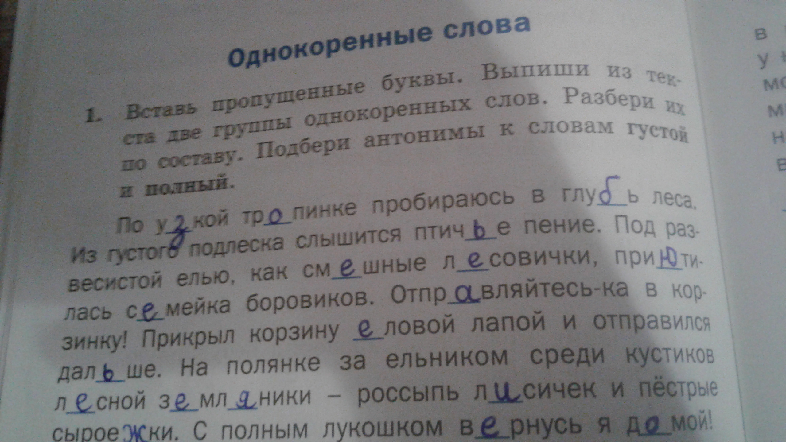 Узкой-узк тропинке-тропинк глубь-глу птичье-птичь смешные-смешн лесовички-лесовичк приютилась-ютилась(при приставка) семейка-семейк