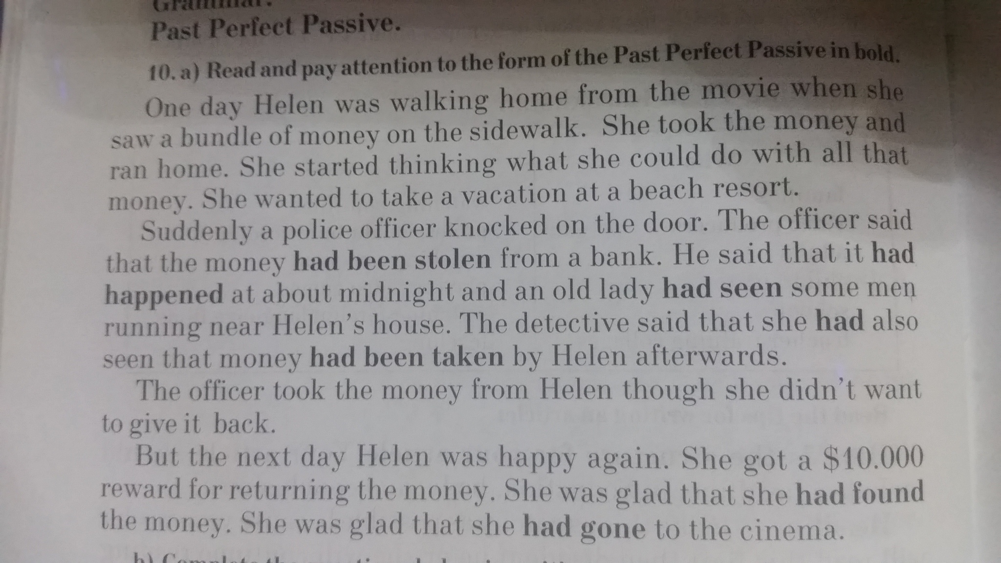 Один расХелен шла с мультика и увидела свёрток денег на тратуаре.Ана взяла его и побежала домой.Она начала думать что ана купит на эти деньги.Она хотела на отпус на пляж.Вдруг в дверь постучалась полиция .