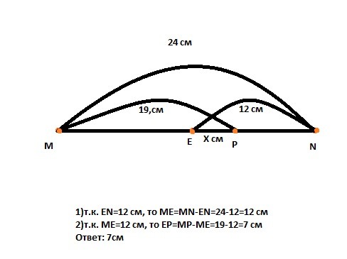 На отрезке MN равно 24 см отметели. Такую что МР равно 19 см и точку Е такую что ЕN равно 12 см Найдите длину отрезка EP. Помогите как её решить пожалуйста!