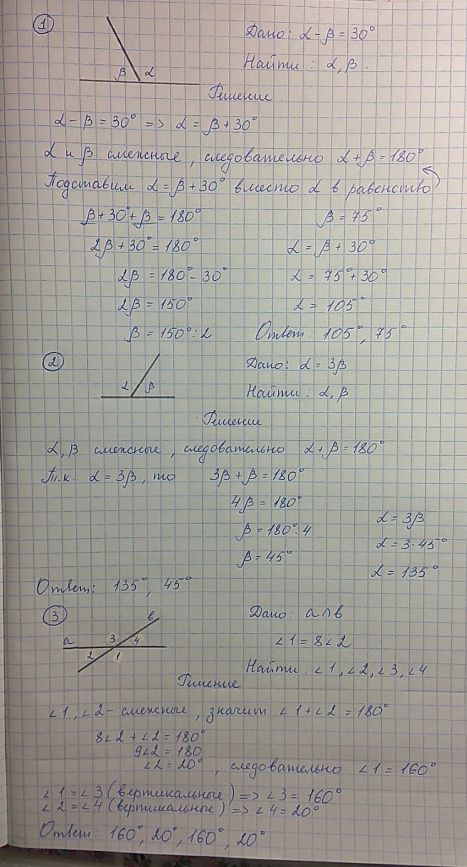 В первых двух заданиях используем свойство смежных углов, в третьем задании добавляем свойство вертикальных углов.
