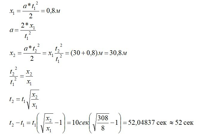 Яхту спускают на воду по наклонным стапелям. Первые 80 см она прошла за 10 секунд. за какое время яхта прошло оставшиеся 30 метров, если движение оставалось равноускоренным?