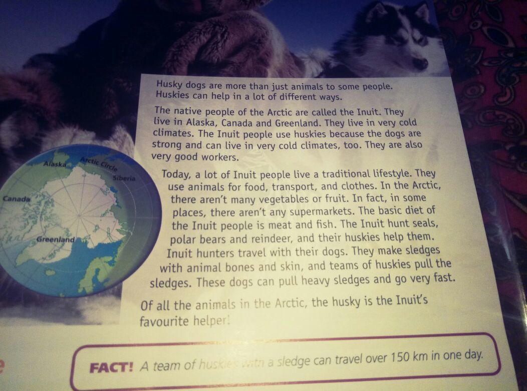 Сегодня множество инуитов живут традиционным способом жизни.Они используют животных как еду,транспорт и одежду.В Арктике не так уж много овощей или фруктов.Кстати говоря,в некоторых местах нет супермаркетов.Обычное меню инуитов это мясо и рыба.Инуиты охотятся на морских котиков,полярных медведей и северных оленей и их хаски помогают им.Инуитские охотники путешествуют с их собаками.Они создают сани из костей и кожи животных и стая хаски передвигают сани.эти собаки могут передвигать тяжелые сани и идти очень быстро.