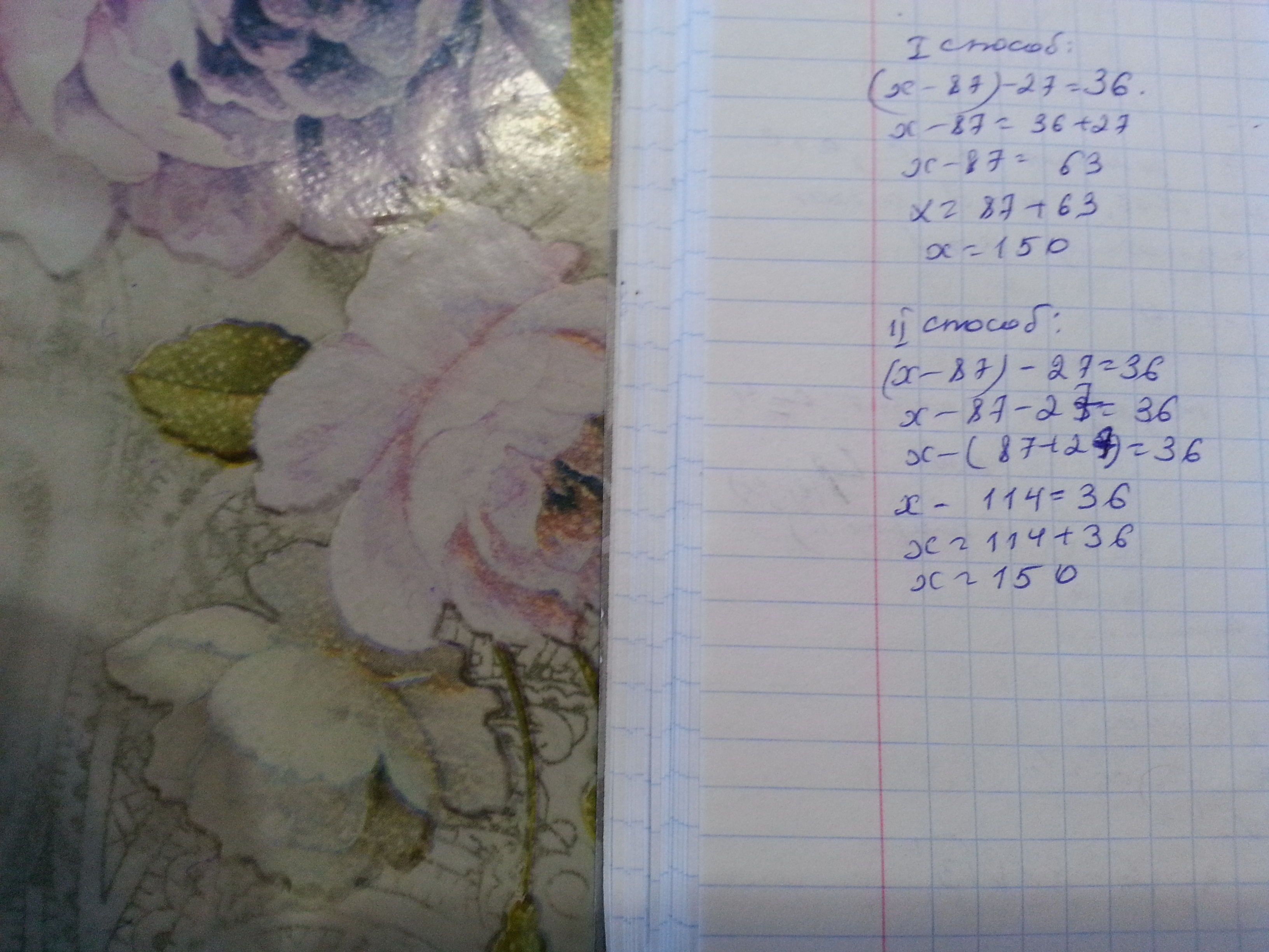 помогите ришить премер вторым способом. НАПРИМЕР: (y+64)-38=48 y+(64-38)=48 y+26=48 y=48-26 y=22. Сам пример (x-87)-27=36 x должен быть равен 150