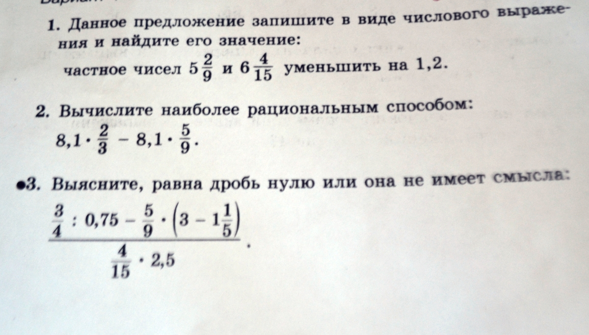 5 2/9 : 6 4/15 - 1,2 = 5/6 - 1 1/5 = -11/30