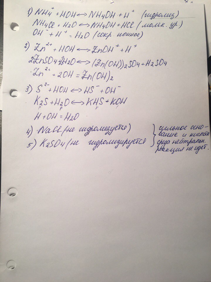 Написать ионно молекулярное ; сокращённо- ионное и молекулярное уравнение гидролиза NH4Cl; ZnSO4, K2S,NaCl, K2SO4