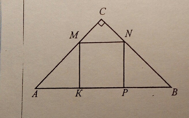 В равнобедренный прямоугольный треугольник ABC с гипотенузой AB вписан прямоугольник KMNP, как показано на рисунке. Периметр этого прямоугольника равен 30 см, а смежные стороны KM и KP пропорциональны числам 2 и 3,т.е KM:KP=2:3. Найдите гипотенузу треугольника.