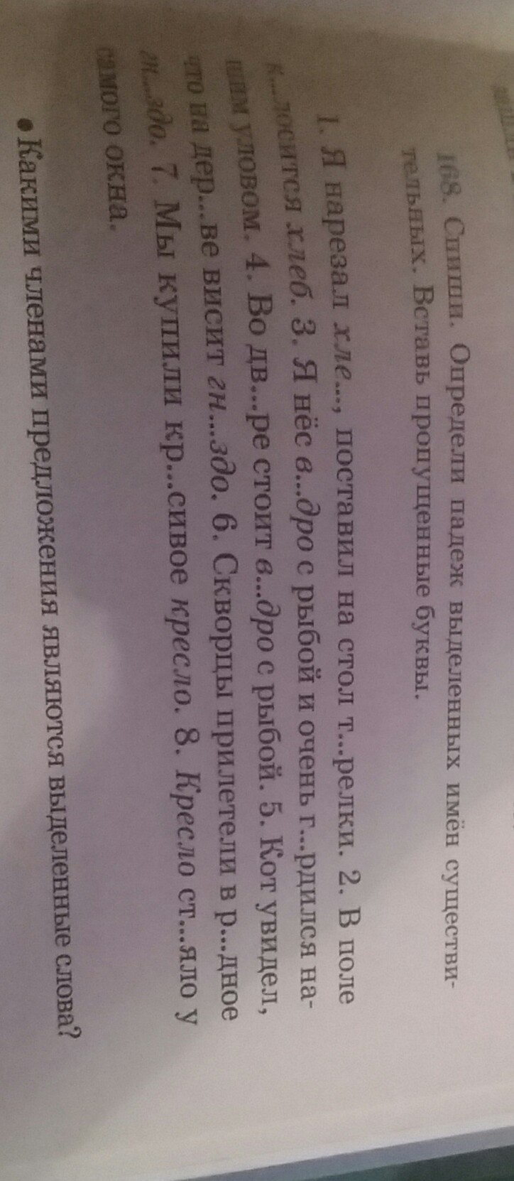 упр 168 Спиши Определи падеж выделенных имен существительных Вставь пропущенные буквы Какими членами предложения являются выделенные слова