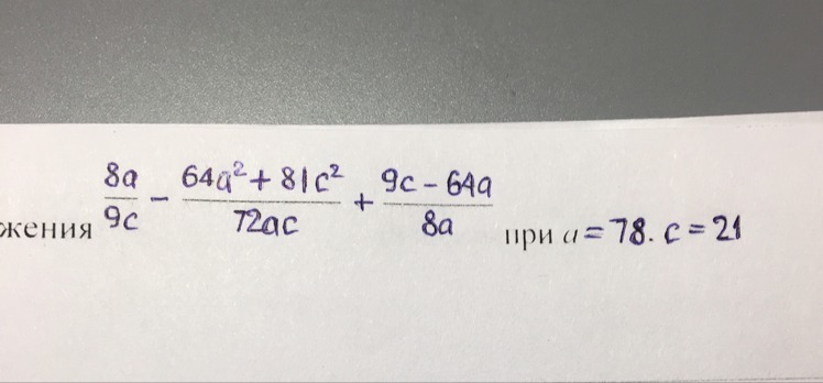 (8a/9c) - (64a² + 81c²) ÷ 72ac + (9c-64a) ÷ 8a = (8a/9c) - ((8/9 × a/c) + (9/8 × c/a)) + ((9/8 × c/a) - 8) = (8/9 × a/c) - (8/9 × a/c) - (9/8 × c/a) + (9/8 × c/a) - 8 = -8