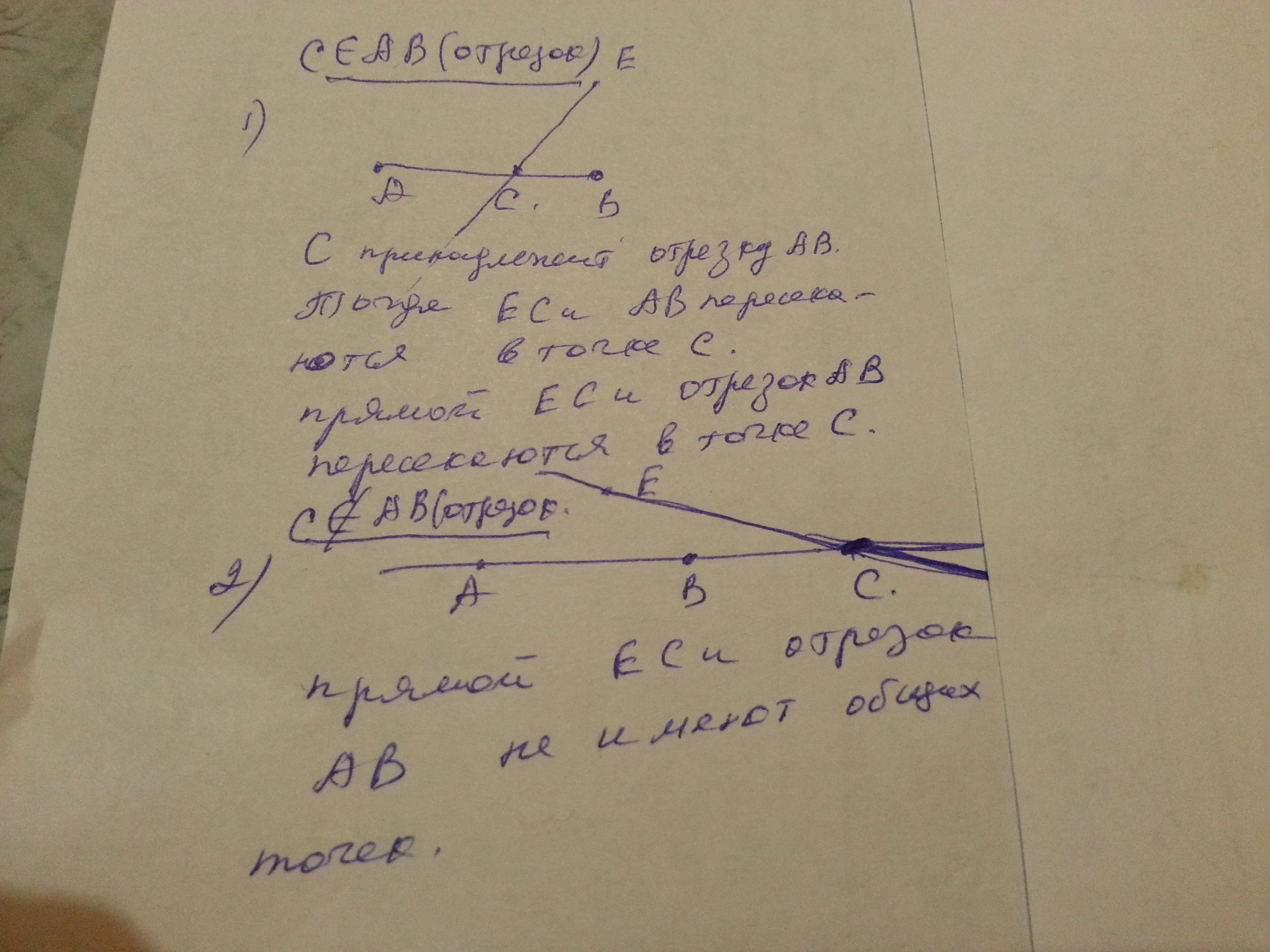 даны отрезок ab точка e не лежящяя на прямой ab и точка c лежяшяя на прямом ab каково взаимное прямой ecи отрезка ab