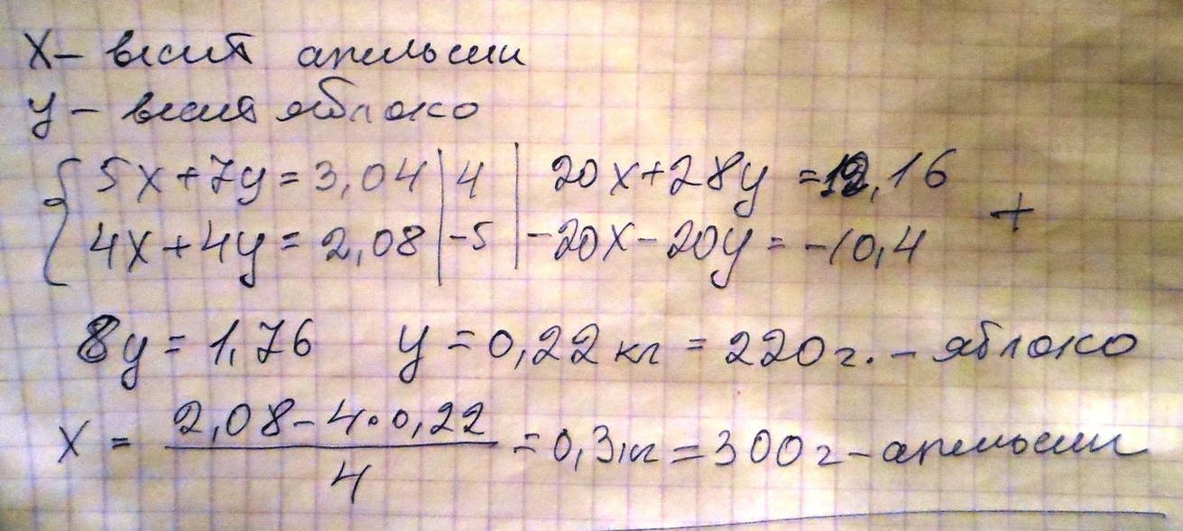 5 апельсин и 7 яблок вместе весят 3кг 40г, а 4 апельсина и 4 яблока 2 кг 80 г. какой вес 1 апельсина и 1 яблока?
