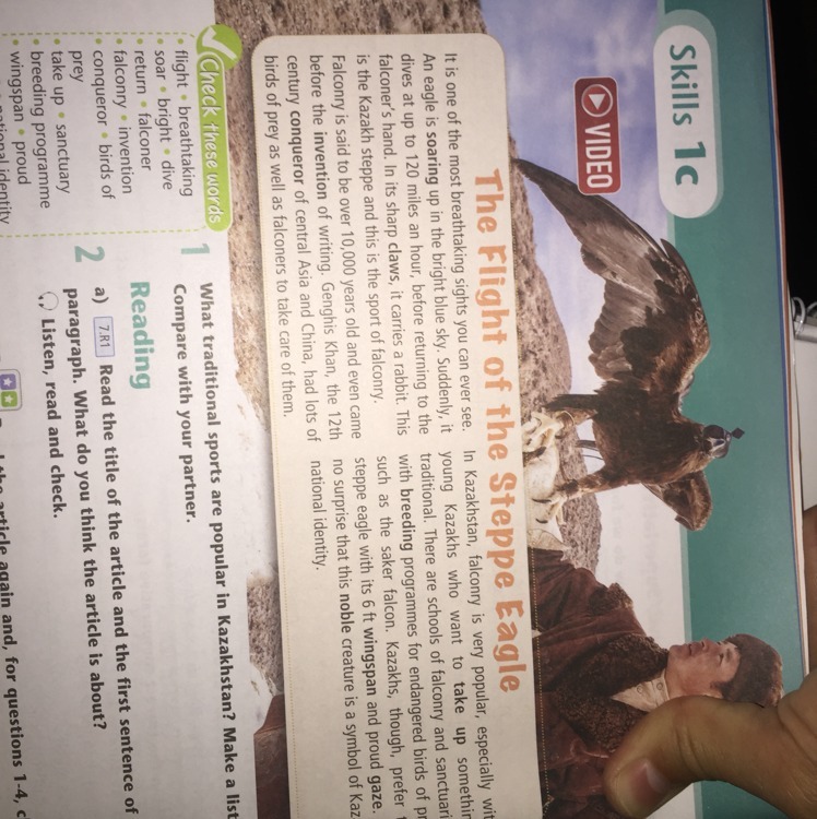 Навыки 1c D ВИДЕО Полет Степи очень популярен, особенно wi Это одна из самых захватывающих достопримечательностей, которые когда-либо можно увидеть. Во что-то вверх Орел взлетает в ярком голубом небе. Неожиданно это молодые казахи, которые хотят взять и освятить погружения со скоростью до 120 миль в час, прежде чем вернуться к традиционному, Есть школы соколиной охоты за птицами. В его острых когтях он несет кролика. Это с программами селекции для находящихся под угрозой исчезновения - это казахская степь, и это спорт соколиной охоты. такой сокольник. Казахи, однако, как говорят, соколиной более 10 000 лет, и даже пришел степной орел с его 6 футов крыла и гордый взгляд перед изобретением письма. Чингисхан, 12-е неудивительно, что это благородное существо является символом завоевателя Кадского века в Центральной Азии и Китае, имело много национальной идентичности. хищных птиц, а также сокольников, чтобы заботиться о них. Какие традиционные виды спорта популярны в Казахстане? Сделать список Проверьте их Сравнить с вашим партнером. Полет, захватывающий дух, погружается в яркое погружение. Чтение первого предложения a) 7R1 Прочтите название статьи, а возвращение охотников за соколиной охоты за соколиной охотой за птицами af возьмите абзац святилища. Как вы думаете, о чем статья? Слушайте, читайте и проверяйте. размножающаяся программа размахивает гордом лун тириром снова, и для вопросов 1-4, c