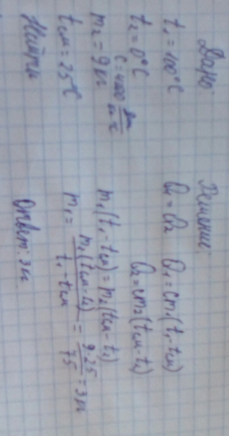 Сколько воды при температуре 100 градусов цельсия нужно влить в воду при 0 градусах цельсия массой 9.0 кг чтобы окончательная температура стала равной 25 градусам цельсия (решение и дано) СРОЧНООО ПОЖАЛУЙСТА