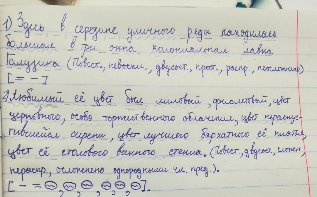 2)Любимый её цвет был лиловый, фиолетовый, цвет церковного, особо торжественного облачения, цвет нераспустившейся сирени, цвет лучшего бархатного её платья, цвет её столового винного стекла.