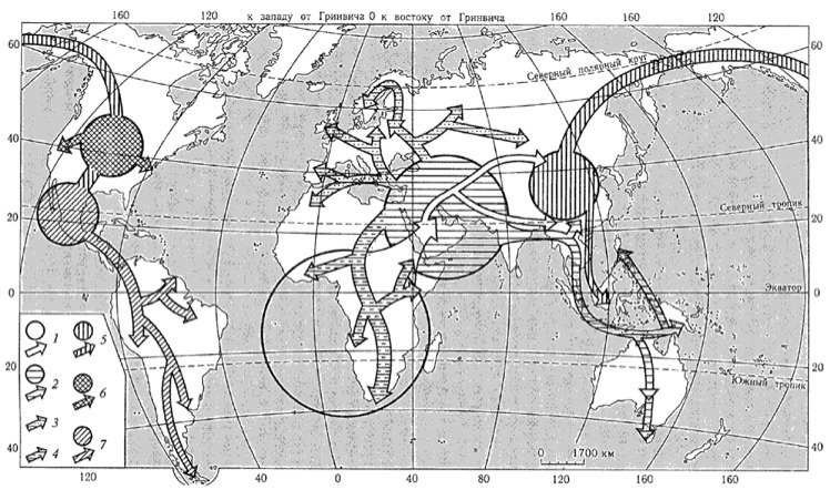 2. 1 — прародина человечества и расселение из нее; 2 — первичный западный очаг расообразования и расселение протоавстралоидов; 3 — расселение протоевропеоидов; 4 — расселение протонегроидов; 5 — первичный восточный очаг расообразования и расселение протоамериканоидов; 6 — североамериканский третичный очаг и расселение из него; 7 — центрально-южноамериканский очаг и расселение из него.