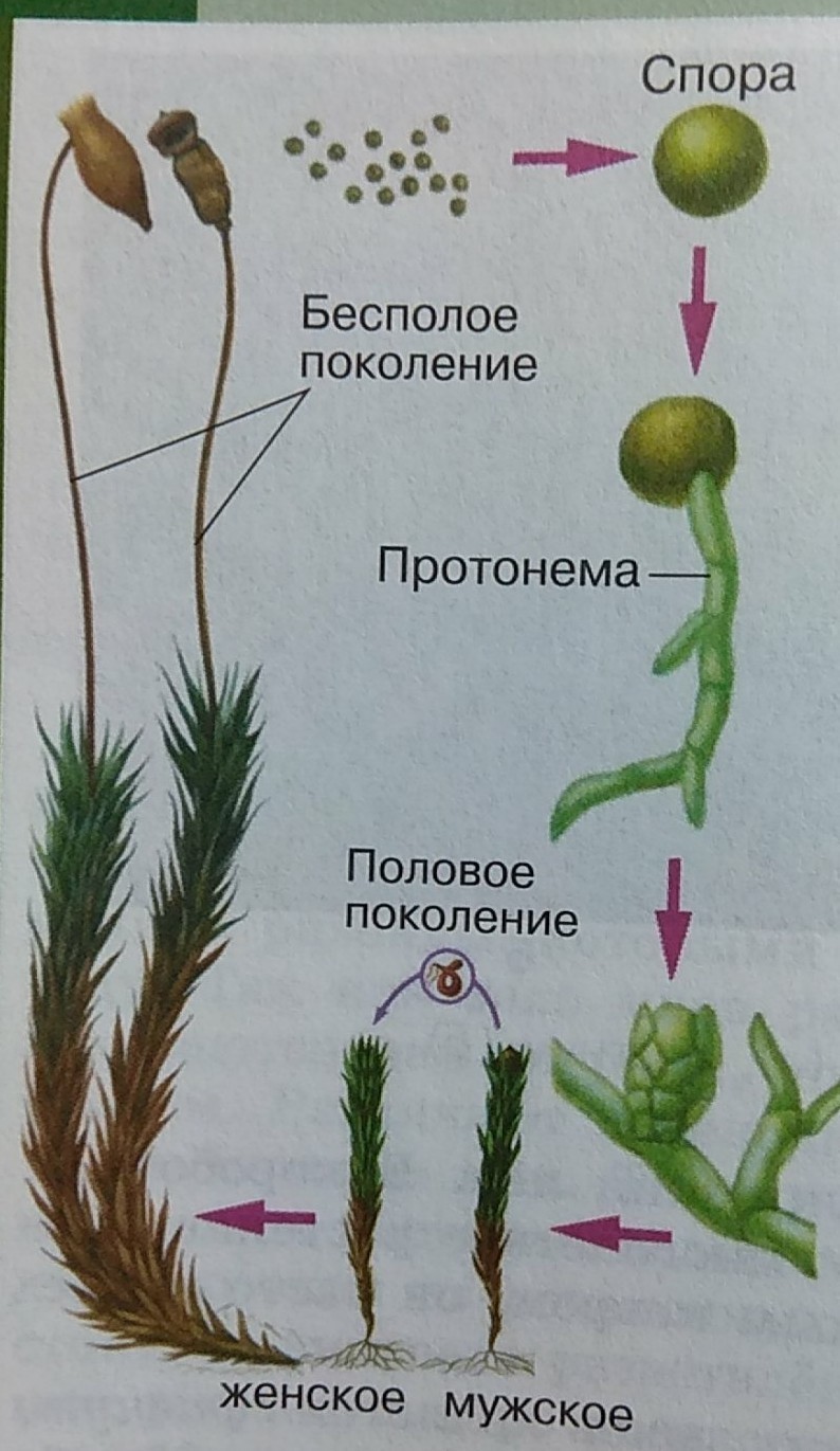 После оплодотворения яйцеклетки архегония сперматозоидом, происходящего при наличии воды, начинает развиваться спорофит. Спорофит состоит из трех частей: стопы, ножки и коробочки, в которой образуются споры. Стебелек и коробочка спорофита называются спорогоном. Коробочка спорогона сверху покрыта колпачком, под которым расположена крышечка коробочки. Внутри находится центральный стержень - колонка, к которой прикрепляется споровый мешок (в нем развиваются споры). Коробочка имеет специальное приспособление для рассеивания спор - перистом. Это зубчики, расположенные по краю коробочки, между которыми имеются поры. Зубчики способны к гигроскопическим движениям, вследствие чего в сухую погоду они открывают поры, через которые высыпаются споры. На земле спора прорастает, образуя протонему, или предросток, в виде зеленой разветвленной нити. На протонеме возникают почки, из которых со временем развивается гаметофит. Кукушкин лен - растение многолетнее ну вот как то так 6:)