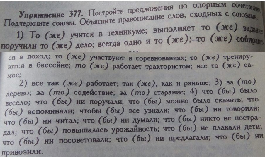 Тоже учится в техникуме; выполняет то же задание; поручили то же дело; всегда одно и то же; собираются в поход; тоже участвуют в соревнованиях; тоже тренируются в бассейне; тоже работает трактористом; все то же самое; все так же работает; так же, как и раньше; за то дерево; за то содействие; за то старание; чтобы было весело; что бы ни поручали; чтобы можно было сказать; чтобы вспоминали; чтобы все узнали; что бы ни говорили; что бы ни читал; что бы ни думали; чтобы никто не пострадал; чтобы повышалась урожайность; чтобы не плакали дети; что бы ни посоветовали; что бы ни предлагали; что бы ни привозили.