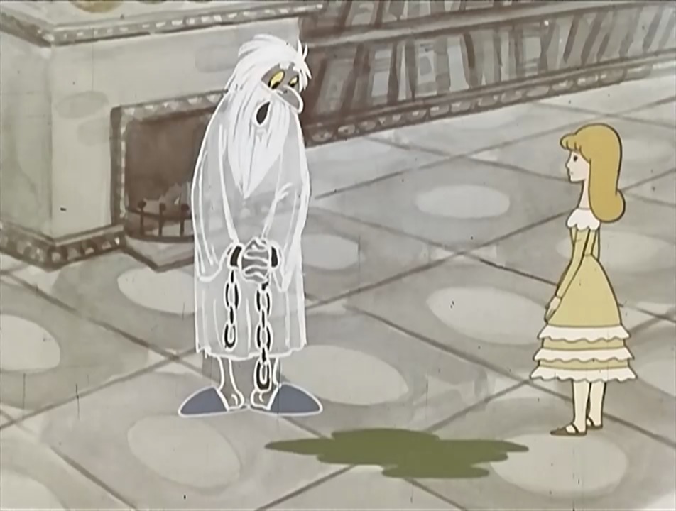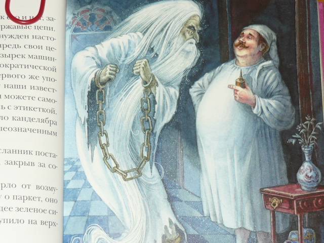 Его глаза были красными.Его волосы серые и длинные.Сам он одет в старомодную одежду.На его кистях и запястьях одеты цепи и наручники.