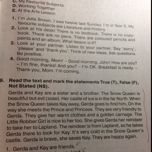 Герда и Кей - сестра и брат. Снежная королева красива, но зла. Ее ледяной замок находится на Крайнем Севере. Когда Снежная королева отнимает Кей, Герда находит его. По дороге она встречает принца и принцессу. Они очень дружелюбны к Герде. Они дают ей теплую одежду и золотую тележку. Маленькая девочка-грабитель тоже с ней мила. Она дает Герде ее оленей, чтобы отвезти ее в Лапландию. Олень из Лапландии, поэтому он берет Герду, чтобы искать Кей. В замке Снежного Ключа очень холодно. Герда смелая, она спасает Кей. Они снова счастливы.