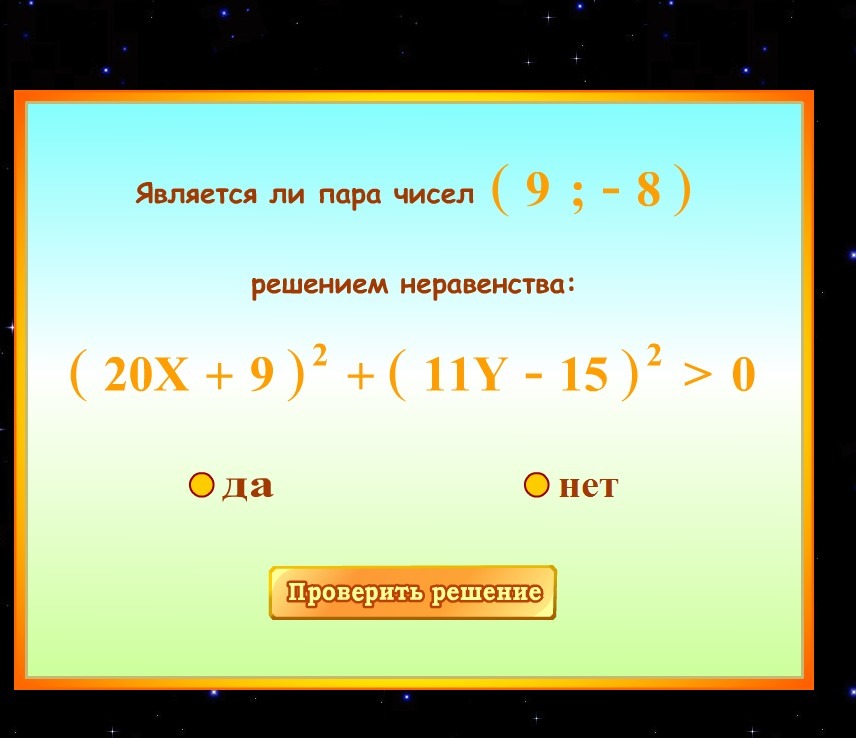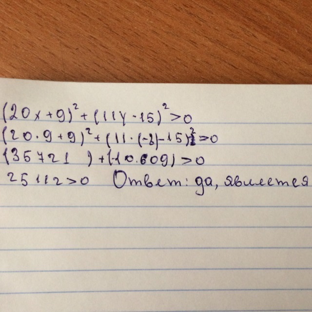 Там же написано: является ли пара чисел(9 и -8) решением данного неравенства. Являются. Решение на листке.